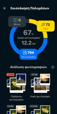 Μην ψάχνετε πια για το τι καταλαμβάνει τον περισσότερο χώρο. Η εφαρμογή αποκαλύπτει τους «γίγαντες» της συσκευής σας: τα μεγαλύτερα αρχεία, τα ογκώδη πολυμέσα και τις εφαρμογές που 'τρώνε' πολύτιμο χώρο. Σας παρέχει μια σαφή επισκόπηση, επιτρέποντάς σας να αποφασίσετε τι θα κρατήσετε και τι θα διαγράψετε, με πλήρη έλεγχο και απίστευτη ευκολία. Ξεχάστε την ακαταστασία και απολαύστε ένα καθαρό και γρήγορο smartphone, χωρίς συμβιβασμούς στην απόδοση ή την αποθήκευση.