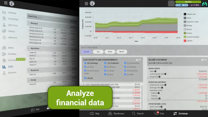 Ξεκινώντας με αρχικό κεφάλαιο και βασικά περιουσιακά στοιχεία, οι καθημερινές σας προκλήσεις περιλαμβάνουν τη διαχείριση της εφοδιαστικής αλυσίδας, από την παραγωγή έως την πώληση στο λιανικό εμπόριο, την εξασφάλιση χρηματοδότησης και τη δημιουργία στρατηγικών συνεργασιών. Η επιτυχία απαιτεί οξυδέρκεια στην ανάγνωση των συνθηκών της αγοράς και την ικανότητα να εκμεταλλεύεστε ευκαιρίες. Μπορείτε να αγοράζετε πρώτες ύλες φθηνότερα από την παραγωγή τους ή να πουλάτε προϊόντα με μεγαλύτερο κέρδος στην αγορά έναντι του λιανικού εμπορίου, κάνοντας κάθε σας κίνηση να μετράει. Η φιλοσοφία του Sim Companies είναι να σας επιτρέπει να επικεντρώνεστε στις ουσιαστικές αποφάσεις που διαμορφώνουν την πορεία της επιχείρησής σας, χωρίς να βυθίζεστε σε ανούσιες λεπτομέρειες ή γραφειοκρατικές διαδικασίες.