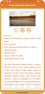 Για απρόσκοπτη πλοήγηση, η εφαρμογή περιλαμβάνει έναν πλήρως λειτουργικό Χάρτη χωρίς σύνδεση. Αυτός ο διαδραστικός χάρτης προβάλλει όλα τα Σημεία Ενδιαφέροντος και, με ένα απλό άγγιγμα, παρέχει λεπτομερείς πληροφορίες και οδηγίες διαδρομής. Χάρη στην ενσωματωμένη δυνατότητα GPS, η εφαρμογή εντοπίζει την ακριβή θέση σας σε σχέση με την πολιτεία του Βερμόντ και τους προορισμούς σας, προσφέροντας οδηγίες βήμα προς βήμα, εκτιμώμενη απόσταση και σημαντικά σημεία αναφοράς. Μπορείτε επίσης να καλέσετε απευθείας ή να ελέγξετε τη διεύθυνση των πάρκων απευθείας από την οθόνη, εξασφαλίζοντας ότι έχετε πάντα τις απαραίτητες πληροφορίες στη διάθεσή σας. Η δυνατότητα αναζήτησης λειτουργεί και ως πλοηγός, καθοδηγώντας σας μέσω του χάρτη με GPS από το ένα σημείο στο άλλο.